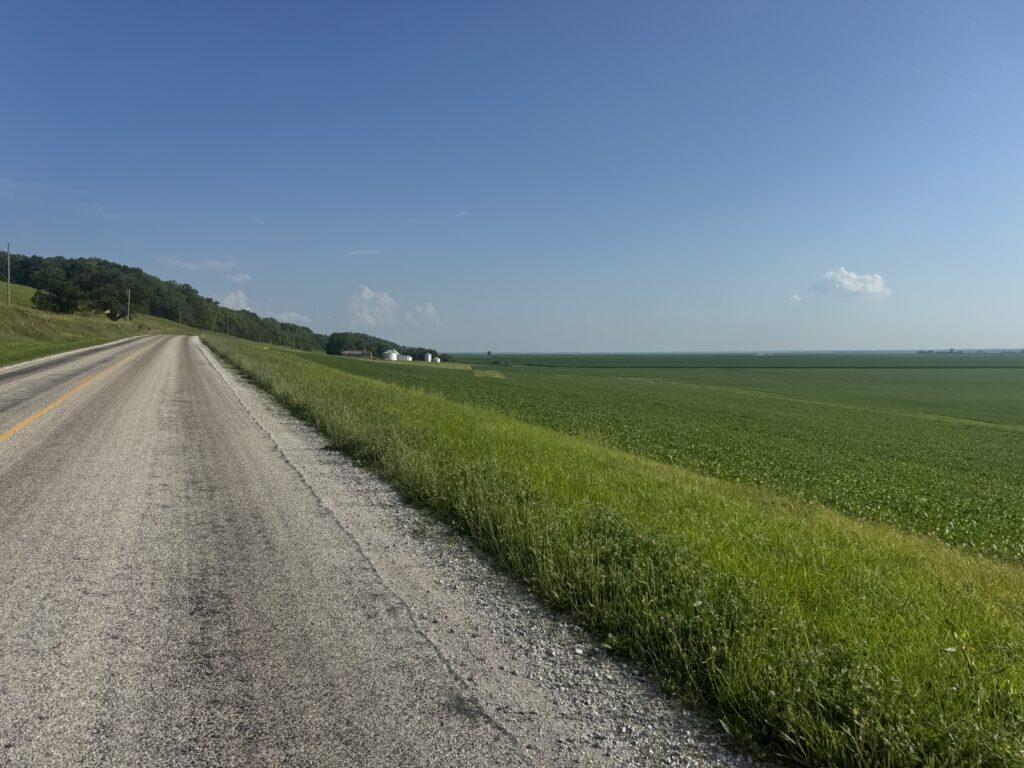 I followed the bluffs of the Iowa River all the way down through Columbus Junction eventually making it down to the wide flood plain of the Mississippi River valley still 10-15 miles away from the river. This was an interesting road because it hugged the bluffs and stayed hilly — presumably to stay high enough out of most of the floodwaters should the river flood. It was interesting to see the houses even farther up and only on the bluff side of the road with only farmland on the river side of the road.